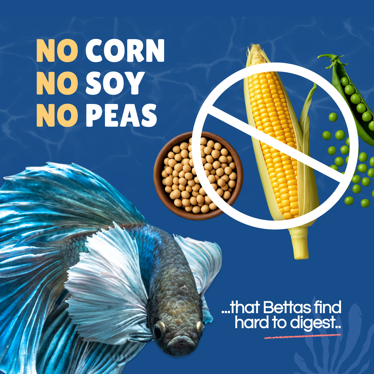 Bettas are carnivores. They aren’t built to digest plant ingredients like soy, corn, or peas — which are often used to inflate protein numbers on labels without delivering usable nutrition.