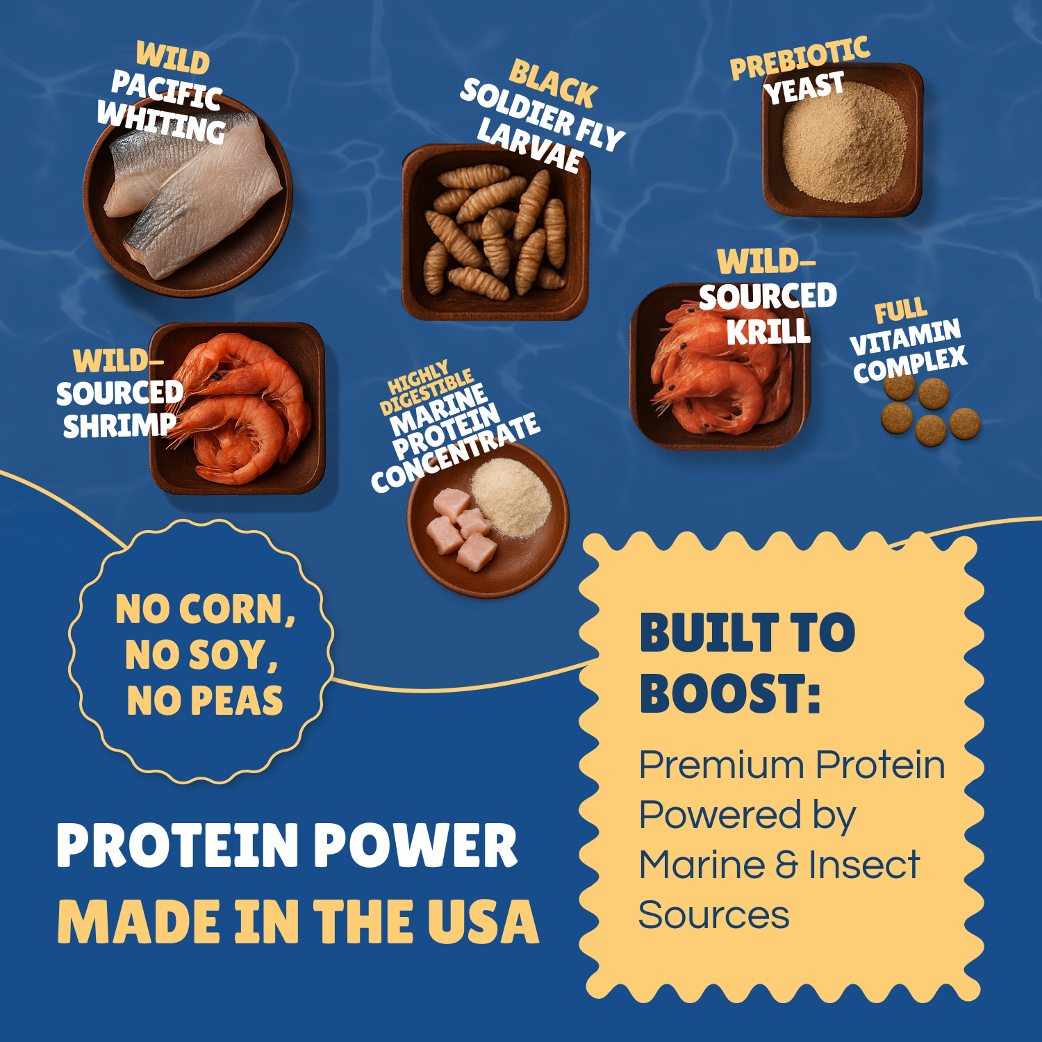 That protein comes primarily from high-quality marine and insect sources —including shrimp, krill, Pacific whiting, and Black Soldier Fly Larvae — with a small contribution from spirulina, which also supports natural color and overall nutrition, and prebiotic yeast, which supports smoother digestion.